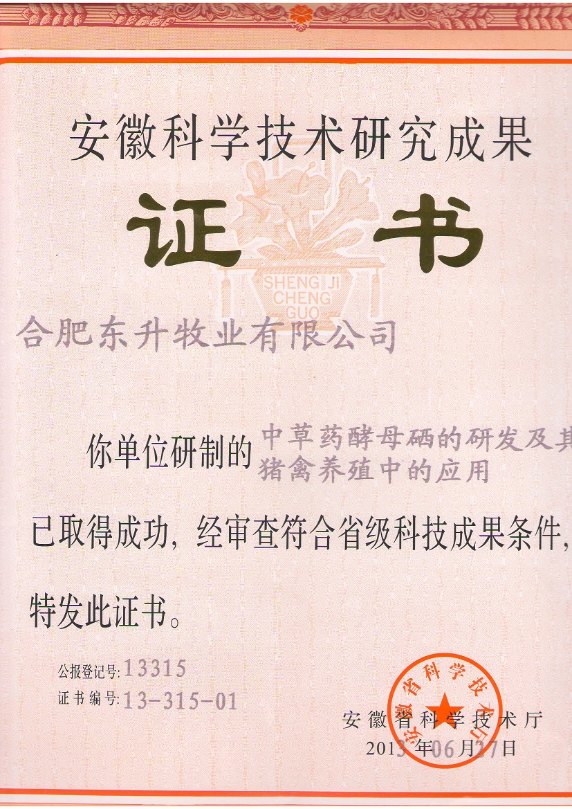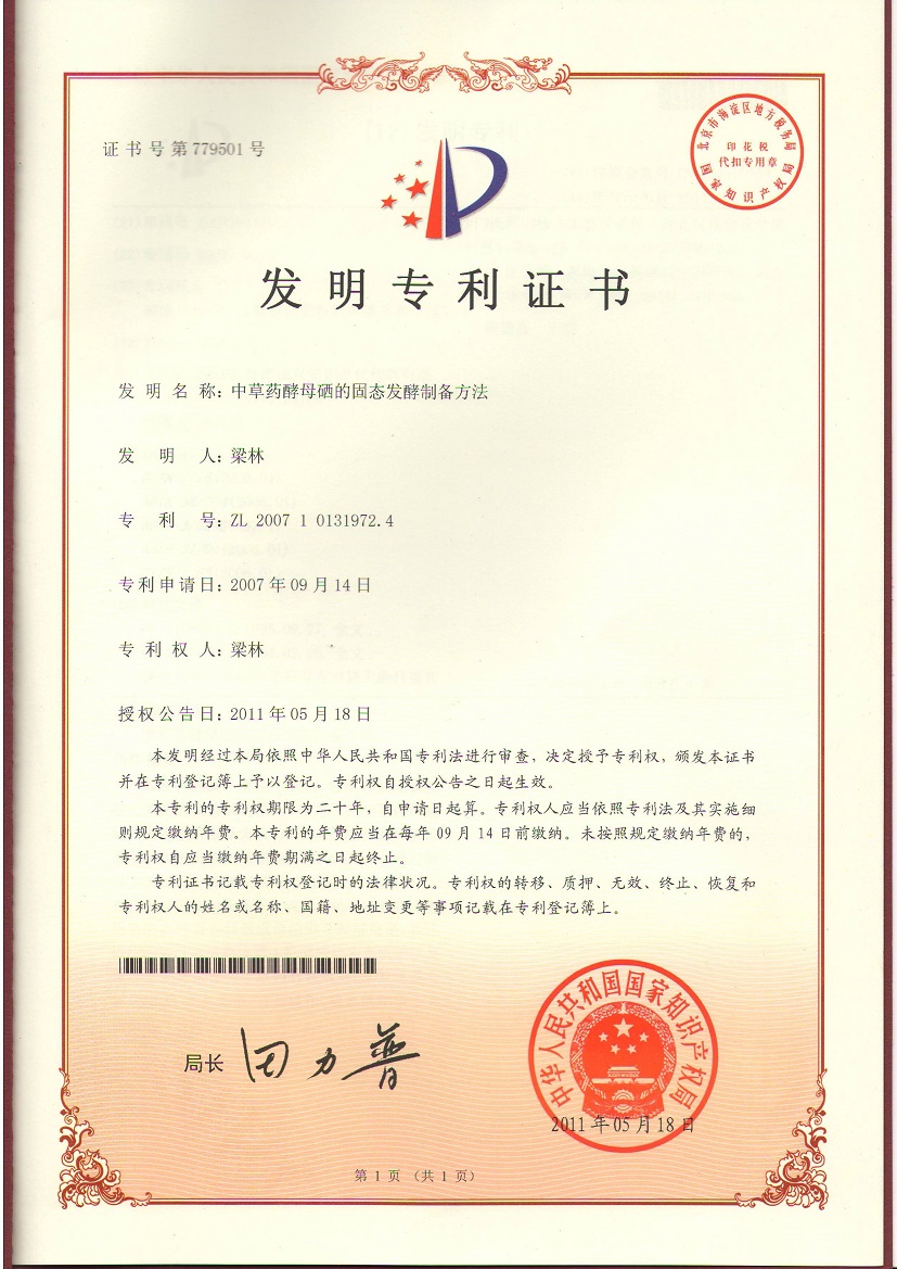 公司獨立擁有中草藥酵母硒的固態發酵發明專利(專利號:ZL20071013191972.4)以及一套通過補充機能性營養素解決免疫抑制和種畜禽繁殖障礙的成功方案。